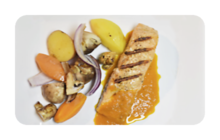 Salmón grillado en salsa de naranja a la pimienta y vegetales salteados a la mantequilla