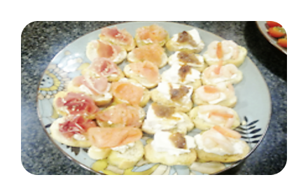 Crostinis de jamón serrano, Camarón, Queso brie mermelada de ají, Salmón ahumado