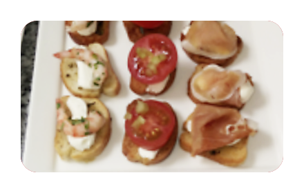 Crostinis de jamón serrano, Camarón, Queso brie mermelada de ají, Salmón ahumado